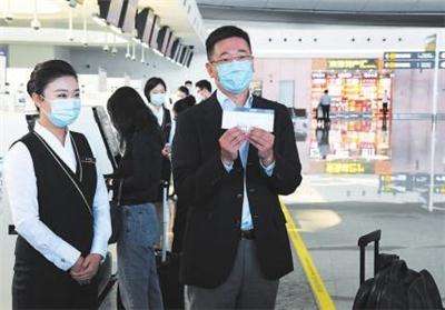 9月22日,在北京大兴国际机场,第1000万名旅客聂先生(前右)展示机票。 当日,北京大兴国际机场迎来第1000万名旅客,标志着北京大兴国际机场自投运以来旅客吞吐量首次突破千万人次大关。预计到2020年底,大兴机场投运以来旅客吞吐量将达到1600万人次。 新华社记者 任超摄