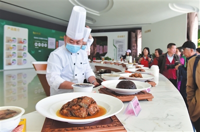 位于新荣区的大同市快康宝食品有限公司引进多条自动化灌装生产线和一系列国内先进设备及螺旋速冻、巴氏杀菌、高温高压灭菌等国内外领先技术,现年产能可达快餐7000万盒,每年可提供就业岗位500人,为新荣区解决150人就业。图为在该公司展示厅内向顾客展示袋装菜产 本报记者张占兵摄