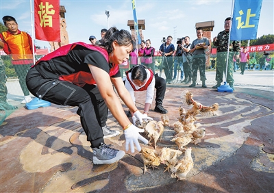 9月23日,参赛选手在趣味运动项目“‘鸡’不可失”比赛中。