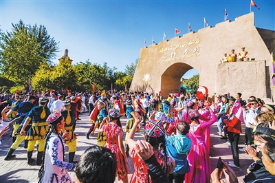 金秋时节,新疆著名旅游景点——喀什古城景区游客日渐增多。自9月初新疆跨省市旅游全面开放以来,喀什古城景区旅游复苏呈现加速趋势。古城景区相继推出民宿家访、手工艺品制作、品尝特色美食等一系列项目,吸引越来越多的游客前来感受古城的烟火气。图为9月20日,在喀什古城景区,《美丽家园》脱贫攻坚电视系列剧演职人员在古城东门进行拍摄。 新华社记者赵戈摄