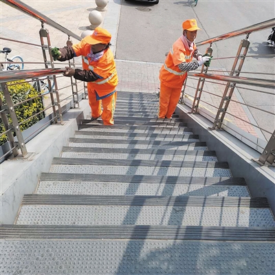 图为环卫工人正在擦洗迎宾街过街天桥护栏。 尚丽摄