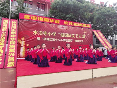九月二十九日,平城区第十八小学水泊寺联盟校的师生们表演了精彩的文艺节目,喜迎国庆的到来。 曹飞摄
