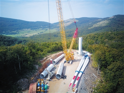 这是航拍的克罗地亚塞尼风电项目风机塔筒吊装施工现场。 北方国际合作股份有限公司2017年11月收购克罗地亚能源项目公司塞尼风电项目76%的股权,并获得项目建设权和长达25年的运营权。塞尼风电项目总装机156兆瓦,建成后预计年均发电3400小时,年发电量5.3亿度,预计2021年6月全部建成并网发电,目前已进入施工高峰期。 新华社记者 高磊摄