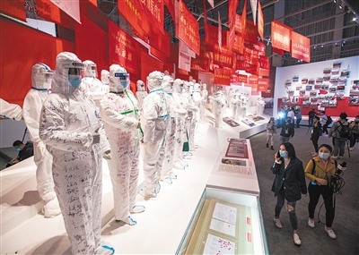 10月15日,人们在抗击新冠肺炎疫情专题展览上参观。 当日,“人民至上 生命至上”抗击新冠肺炎疫情专题展览开幕式在湖北省武汉市举行。这一展览由中宣部指导,湖北省委、省政府主办,共分6个部分,展出照片1100余张,实物展品1000余件,视频45个,大型场景33处。 新华社记者 肖艺九摄
