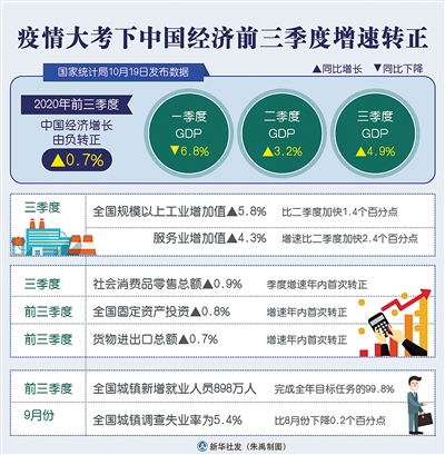 国家统计局19日发布的经济“三季报”显示,疫情大考下中国经济逐季转好、稳定恢复,展现强大韧性。在全球疫情尚未得到有效控制、世界经济陷入衰退的背景下,中国经济率先复苏,为世界经济注入正能量。