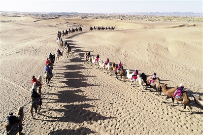图为10月21日,游客在阿拉善通湖草原旅游区体验沙漠乘骆驼旅游项目(无人机照片)。