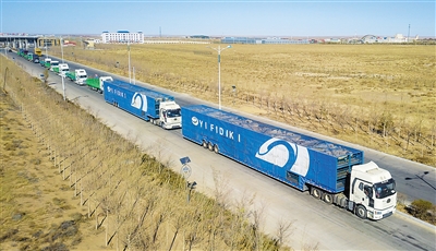 10月22日,载羊货车通过内蒙古二连浩特口岸(无人机照片)。