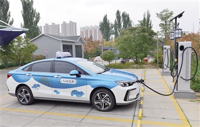 纯电动汽车作为新能源汽车的重要成员,以其零污染、低耗能的显著优势,逐步融入市民的生活中。为了方便电动汽车能够及时充电,我市在部分地段陆续建了电动汽车充电站。大同平城新能源科技有限公司在东城墙带状公园和西城墙带状公园的停车场内,建设完成了4所智能充电站,这4所智能充电站共安装55个充电桩,可同时满足110辆电动车的充电需求。图为新能源电动出租车正在充电站内充电。