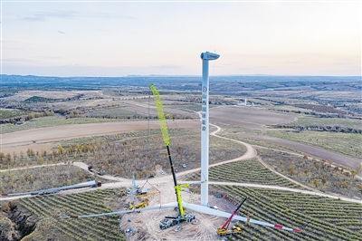 图为位于新荣区堡子湾乡的山西光瑞新能源堡子湾乡风电项目正在加紧调运安装。该项目总投资达8.77亿元,设计安装38台风力发电机组,于2019年10月开工建设,目前土建施工接近尾声,风力发电机组安装完成20台,30公里集电线全部完工,110kV外送线路塔基全部浇筑完成。 本报记者 于宏摄