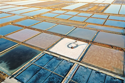 时值海盐收获季,位于山东省青岛市城阳区的青岛东风盐场收盐工作全面展开,扒盐机械和收盐车辆在盐池中往来穿梭,收盐工人忙碌其间。