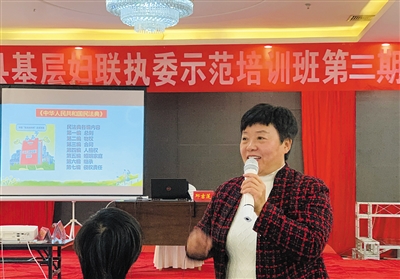 历时半个月,全县三期基层妇联执委示范培训班圆满结业,该县妇联主席高芳表示,此次培训取得了良好的成效,学员们学习态度端正,纪律严明,不仅提高了理论水平、工作能力,而且提升了个人素养。希望学员们能够学以致用,把学习成果运用到日常工作中,主动担当作为,不断提升基层妇联组织的凝聚力、战斗力。(李炯)