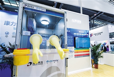 这是11月11日在同方展台展出的核酸采样人员正压防护采样舱。