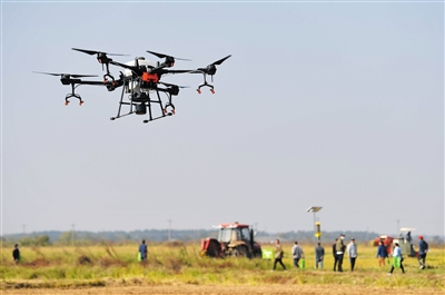 11月14日,在江西省南昌县蒋巷镇大田农社智慧农场,无人机植保设备在进行现场演示。当日,由江西省农业农村厅和南昌市人民政府共同支持的江西首个万亩智慧农场发布暨智能农业装备全程机械化作业演示活动在南昌县蒋巷镇大田农社智慧农场举行。20多家厂商生产的收割、旋耕、机插秧、植保等机械设备及无人作业农机设备进行了现场演示,吸引了大批观展者前来一睹智慧农业新面貌。 新华社记者 彭昭之摄