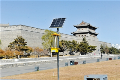 图为东城墙带状公园安装的太阳能杀虫灯。太阳能杀虫灯白天接收太阳光并进行储能,晚间智能电控系统自动启动紫外线光源,开启太阳能灯,产生光亮诱杀害虫,照明与灭虫兼而有之,市民为此点赞。 本报记者 于宏摄