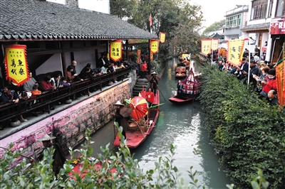 11月15日,游客在和孚镇荻港村观看“水上晒秋”丰收庆典。