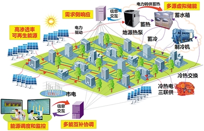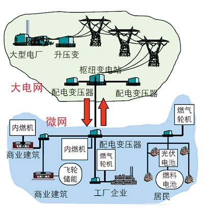 为协调大电网与分布式电源间的矛盾,充分利用分布式电源为电网和用户带来的价值和效益,提出了微网(微能源网)的概念。欧盟对于微电网的定义是:微网是利用分布式能源、储能装置和可控负荷共同组成的低压网络,容量范围从几百千瓦到几个兆瓦,能够与配电网并联运行,在上一级电网故障时可脱网独立运行,故障恢复后可重新并网。国网电科院对微电网的定义是:微网是由分布式电源、储能和负荷构成的可控储能系统,可平滑接入大电网和独立自治运行,是发挥分布式电源效能的有效方式。