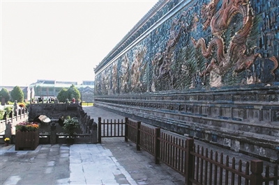从四牌楼往东,有一条街叫和阳街。沿着和阳街一直走,会看到一排新筑的木栅栏围墙,隔着围墙往里看,金光灿灿的九龙琉璃照壁屹立眼前。这便是面貌焕然一新的九龙壁景区。