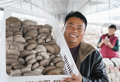11月17日,河北省顺平县白云乡常大村的一位农民在大棚内展示刚采摘的蘑菇。近年来,河北省顺平县引导农民采取“专业合作社+基地+农户”的模式,发展食用菌、设施蔬菜、设施草莓等果蔬种植,有效地促进了当地农业产业化的发展。