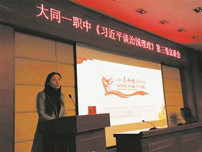 是日,在该校综合楼五楼多功能报告厅,大同一职中德育和思政工作室成立系列活动之一的《习近平谈治国理政》第三卷宣讲会正在进行。特邀嘉宾山西省基层理论示范宣讲团成员、大同市教育电视台策划部主任冯伟作了题为《从疫情大考中看中国制度优势》的专题宣讲。她以鲜活生动的语言解读疫情防控阻击战,是一场大仗、硬仗,我国能够在短时间内取得阶段性成果,最大的优势就是制度优势。疫情考验的是我们应对突发事件的能力,考验的是我们社会治理的能力。疫情中,我们看到中国特色社会主义制度的显著优越性和强大生命力,看到了中国政府抗击疫情的措施有力、行动高效。