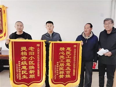 本报讯 (记者 辛雅君) 11月7日,安益园小区居民们和物业站将写有“惠民工程惠及百姓,精心施工居民称赞”以及“老旧小区换新颜,提档升级惠民生”的两面锦旗送到平城区老旧住宅小区综合整治总指挥部,对带给小区居民的实惠表示感谢。