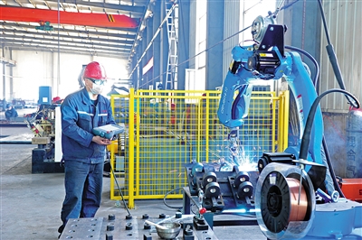 图为大同市广大民防设备有限责任公司铆焊车间,工人正在使用智能电焊手臂焊接工件。近年来,该公司累计完成人防防护设备和人防防化设备安装工程500余项。据了解,该公司年生产能力达1亿元,年产值约6500万元。