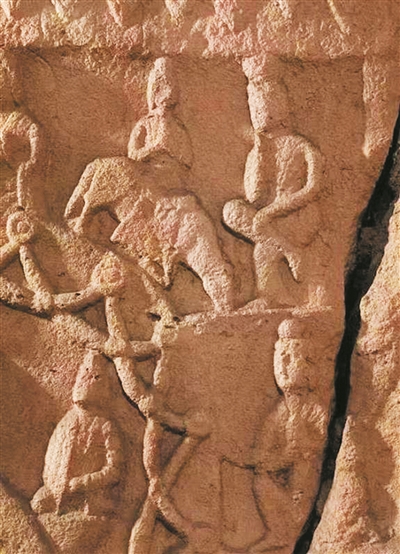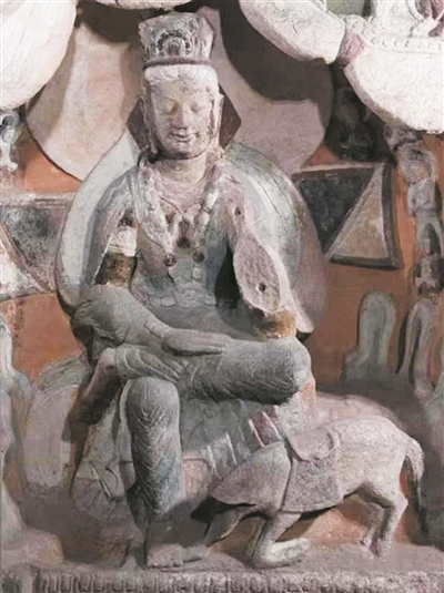 这种形象塑造,生动地再现了故事中人马情感交织的情绪。其中第6窟刻画得极为突出。这是云冈石窟佛传故事画面中,首次出现的以龛像形式塑造的故事片段。这一表现形式,突出了释迦成佛过程的阶段性。太子由宫中逾城出家来到苦行林中,标志着其成就佛道走出了重要一步。在佛教看来,这是具有里程碑性质的事件。这是对白马吻足为什么以龛像形式刻画最有说服力的解释。龛中太子为右舒相坐于盝形帷幕之下,并作思惟状,表示其经过反复斟酌而下决心离开凡间去寻找出路的信心已经确立。其身后和脚下雕有起伏的山峦,表示了其所处的地方在“苦行林中”。抬起腿的左侧脚下,雕刻了背上搭鞍、前腿跪地,低头伸嘴舐右脚的爱马“犍陟”(马的头部风化坍塌)。人和马依依惜别之情表现得淋漓尽致,可谓“此时无声胜有声”。