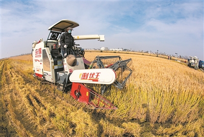 时下,江苏省南京市六合区种植的晚稻进入收割期,当地农民及时抢收。