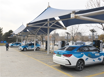 位于东城墙和西城墙附近的4座智能充电站投入使用以来,极大地方便和满足了电动汽车车主充电的需求。车主可以通过互联网交通属地智能化充电平台“大同充电”,预约充电、扫码支付实现智慧停车与智慧充电的便民服务。图为在“平城充电站”C站内充电的新能源电动出租车。 本报记者 戎禹仁摄