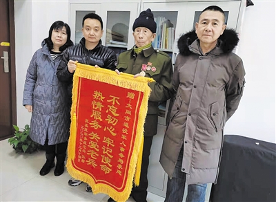 市退役军人事务局思想政治和权益维护科李建与科室同志积极为全市抗美援朝老战士服务,得到老战士们的赞誉。12月14日,参加过抗美援朝的老战士张瑜(右二)在家人的陪同下,向李建(左二)赠送了“不忘初心 牢记使命 热情服务 关爱老兵”锦旗。