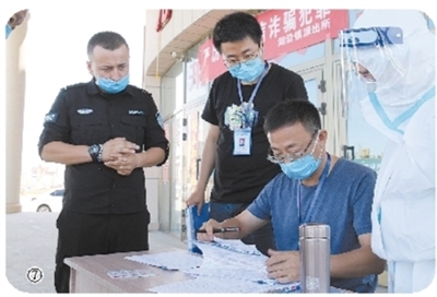 图⑦ 疫情期间,大同市援疆干部在防疫一线对外出回场人员进行核酸检测。