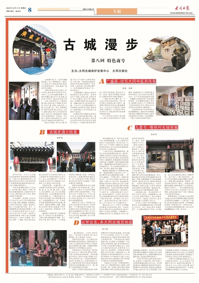 古城故事多,值得认真品味。由大同日报社和大同市古城保护发展中心联合推出的“古城漫步”章回系列从5月至12月隆重推出以来,受到本地市民和外地游客的一致好评。每月一个主题,到12月共策划8大主题,每期记者、读者、作者、文化学者互动,走进四合院、名人故居、文化场馆、客栈民宿、特色商号,探访古城人家,深度解析古城内涵。章回系列期期出彩,精品迭出,产生广泛的社会影响。不少导游、讲解员还将这些文章自行“汇编”成册,在设计古城旅游线路时引入其中的精彩亮点,向游客推介。金安客栈、一水街客栈、九章号、山西老酒博物馆等商号主人积极推介每期报纸,“古城漫步”章回系列期待更多精彩。