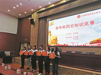 本报讯 (记者 解慧) 为营造学校浓厚的思政学习氛围,夯实学生成长、成才的思想基础,增强学生文化自觉、文化自信意识,在学思践悟中坚定理想信念,在奋发有为中践行初心使命,近日,大同师范高等专科学校举办春华杯“四史”知识竞赛活动。学校领导、社科部和中文系师生共513人观摩了本次活动。