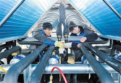 大同市悦凌空调有限公司瞄准国际制冷行业创新趋势,在现有空调制冷技术基础上,不断提升企业自主创新能力和内生发展动力,先后研发制造出了悦凌洁净新三能系列产品及超低温空气源热泵机组等,解决了空气源热泵机组不能在超低温条件下启动的难题,大幅提高了清洁能源利用效率。图为该公司工作人员正在为超低温空气源热泵采暖机组管路做保温层。 本报记者 于宏摄