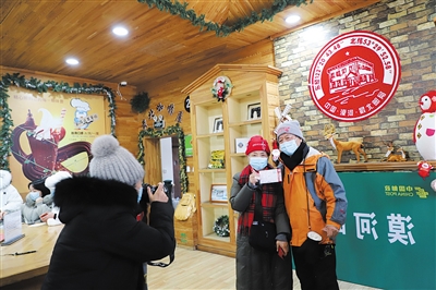 北极村邮政支局位于黑龙江省漠河市北极镇北极村,是中国最北邮局。随着当地旅游业蓬勃发展,北极村邮政支局已成为漠河市的旅游景点。图为12月28日,游客举着明信片在北极村邮政支局合影。 新华社记者 孙晓宇摄