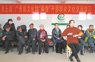 本报讯 近日,灵丘和广灵两县的文化馆共同举办了群众文化交流活动。灵丘县和广灵县地域相连,习俗相近,乡土文化具有千丝万缕的联系。两县共同举办群众文化交流活动,具有独特优势。活动当天,灵丘红石塄秧歌剧团、腰站秧歌剧团一行40余人驱车前往广灵县北岳庄村,与北岳庄村秧歌剧团进行交流学习。