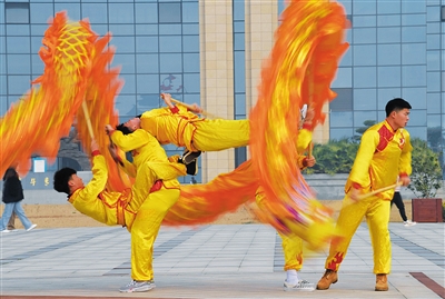 12月27日,在江西师范大学科学技术学院,龙狮队的队员们进行舞龙训练。