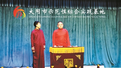 此次研学活动中,曲艺社的老师为同学们进行了多种形式的数来宝表演,他们语言诙谐幽默,表演富有亲和力,在给同学们带来欢乐和笑声的同时,也使同学们认识了大同数来宝的艺术内涵,对大同深厚的文化底蕴、民风民俗等有了更进一步的了解。研学中,同学们相互交流、畅所欲言,对这项艺术形式产生了浓厚的兴趣。在学习了基本的表演技巧后,同学们跃跃欲试,纷纷换上表演服装,亲自当了一回相声演员,表演了数来宝名段《大同大不同》,感受了艺术和舞台的魅力,在无形中培养了兴趣爱好和艺术鉴赏能力。