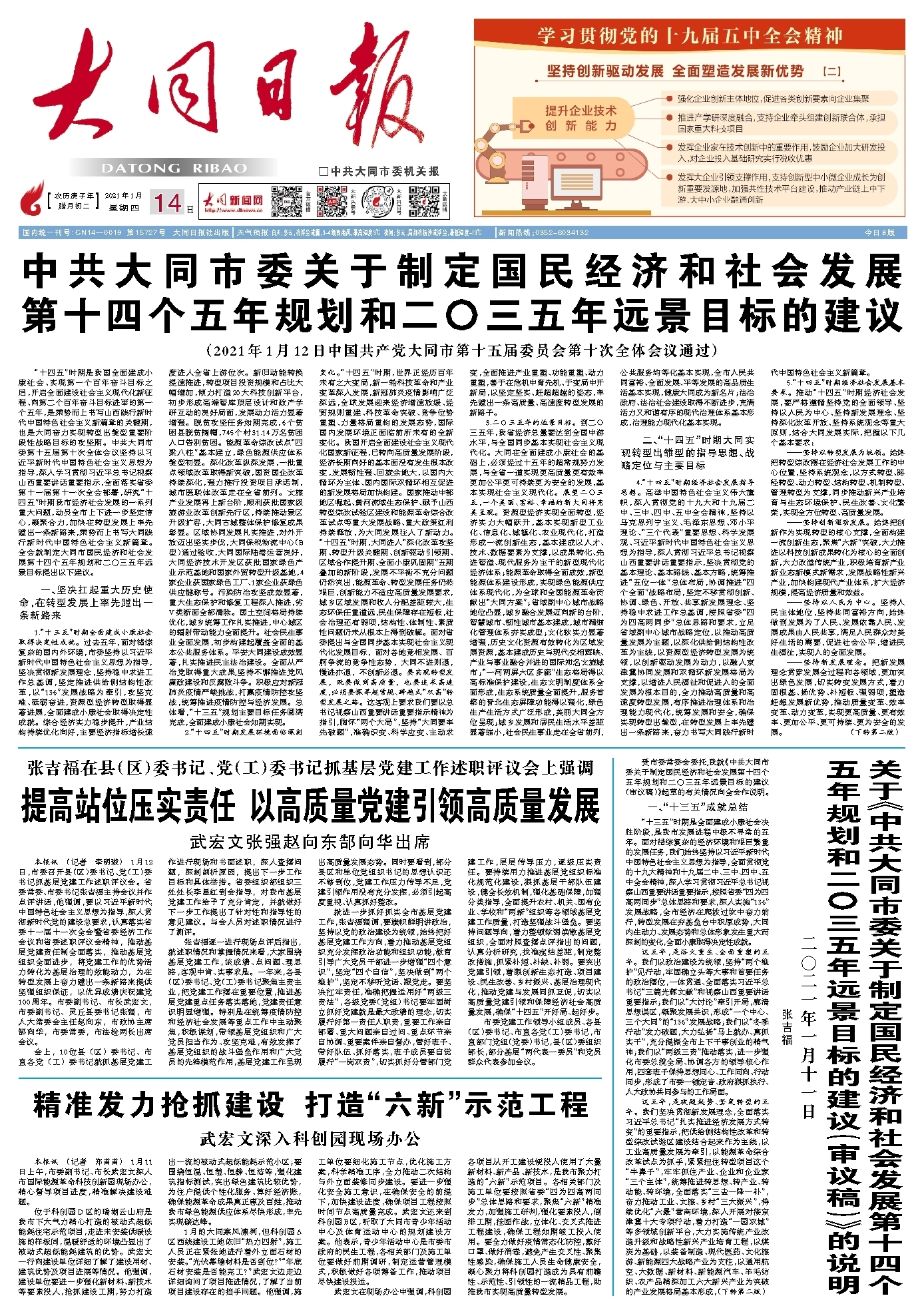 中共大同市委关于制定国民经济和社会发展 第十四个五年规划和二○三五年远景目标的建议