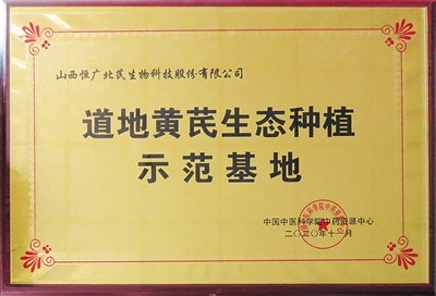 十年耕耘,硕果飘香。2014年8月被国家中医药管理局中国中药协会授予“道地药材黄芪保护及生产(野生抚育)基地”;2016年5月,公司受中国中药协会种子种苗专业委员会邀请,参加专委会成立大会并成为会员单位;2018年入选中药材品牌建设第一批名单,同时被中国中医科学院中药资源中心命名为“道地药材黄芪原生态种植全国示范基地”;2018年9月被山西省农业厅评为“中药材标准园建设单位”,2018年,公司参与了《中华医药学会中药材商品规格等级(黄芪)标准》的起草和制定工作;2020年10月被中医科学院中药资源中心命名为“黄芪野生资源保护及生态繁育生产示范基地”“黄芪生态种植示范基地”。