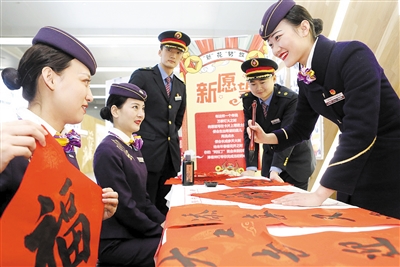 2月9日,铁路上海客运段高铁一车队的员工在乘务员之家书写春联。