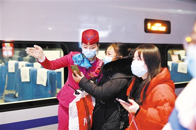 2月11日,在成都东站站台,成都东开往杭州东的G2187次列车列车长阳红梅(左一)引导旅客乘车。