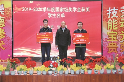 中等职业教育国家奖学金是国家面向中职学生设立的国家级最高荣誉奖项。全国每年共奖励2万名学生,奖励标准为每人每年6000元。大同二职中从学生学习成绩、道德风尚、专业技能、社会实践、创新能力、综合素质等方面,对在校中职生进行综合评定。最终,18机电1班张磊和18计算机3班庞奕飞两名学生获得中等职业教育国家奖学金。