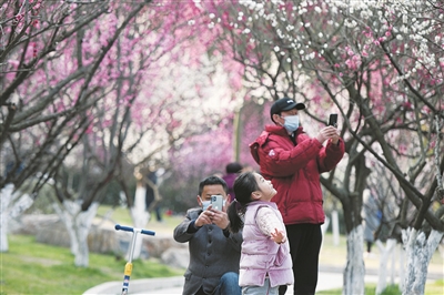 2月17日,游人在合肥市匡河岸边的梅花丛里游玩。