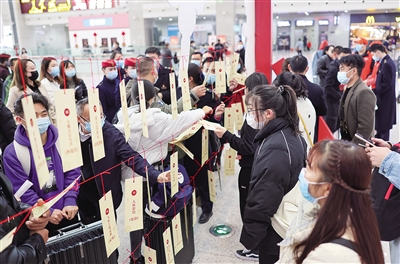 2月26日,在重庆北站北广场候车室内,旅客们在猜灯谜。 当日是农历正月十五元宵节,重庆北站北广场候车室搭起了喜庆的牛年牌坊、挂起了灯谜,面向旅客开展“猜灯谜、闹元宵”活动,给出行旅客增添了别样的节日乐趣。 新华社记者 刘潺摄