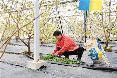 3月1日,工人在吴兴高新区灵粮农场的樱桃大棚内除草。