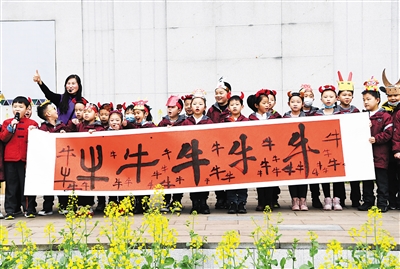 3月1日,重庆两江新区青禾童心小学学生在开学典礼上展示现场书写的书法作品。