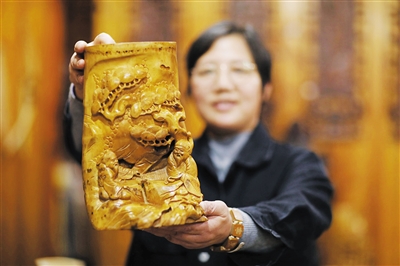 2019年6月,赤水“竹雕工艺”被列入贵州省级非物质文化遗产名录。为了将技艺更好地传承下去,卢华英免费培训学员,使赤水竹雕成为带动当地农民增收致富的产业。图为2月28日,在贵州省赤水市石沓沓非遗馆,卢华英在展示自己制作的竹雕工艺品。