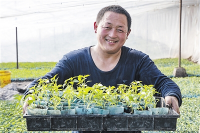 春耕时节,位于哈尔滨市的黑龙江省红旗农场发挥设施蔬菜生产优势,推进棚室蔬菜育苗生产。目前,农场育苗量已近100万株,品种主要是番茄、辣椒、黄瓜、豆角、白菜等,预计3月末4月初开始栽种。图为3月1日,在黑龙江省红旗农场农业园区温室大棚内,种植户展示秧苗。 新华社发(张涛摄)