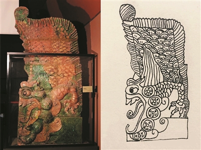 我国古建筑的屋顶,多是由一条正脊和四条垂脊组成的,统称为五脊。在正脊的两端,有一个威武严肃、外形像鱼的小兽,它就是我们今天的主角——鸱吻。鸱吻从何处来?这要从中华民族龙文化说起。龙是我们炎黄子孙崇拜的图腾,它表现威武奋发、勇往直前和不屈不挠的精神。人们崇拜龙,希望龙能帮助避邪除灾,帮助战胜自然灾害,给人们带来吉祥,对中华文化影响深远。因此,在古建筑中更不乏龙文化的缩影,尤其体现在中华传统建筑的雕塑装饰物上。鸱吻,是龙的九子之一。它喜欢在险要处东张西望,也喜欢吞火,所以人们将它置于房脊两端,以避火灾,同时也为古建筑增添了许多美感。在大同市博物馆辽金展厅所展出的琉璃鸱吻通体高2.68米,整件文物体型庞大,釉色斑斓,造型精美,它是华严寺下寺薄伽教藏殿屋顶上的原件,为辽代之物,后在维修建筑时取下,收藏于大同市博物馆。这对琉璃鸱吻还有一个特殊功能,即在薄伽教藏殿的正脊和檐角是殿顶两坡的交汇点,雨水从交汇点的缝隙容易渗入,琉璃鸱吻在此处可以严密封固瓦垄,使脊垄既稳固又不渗水。