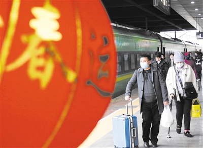 3月8日,2021年春运迎来最后一天。国务院联防联控机制春运工作专班数据显示,今年春运全国铁路、公路、水路、民航共发送旅客预计达到8.7亿人次,比2019年同期下降70.9%,比2020年同期下降40.8%。各地积极响应“就地过年”号召,客运量较往年降幅明显。图为旅客在四川达州火车站乘车出行。